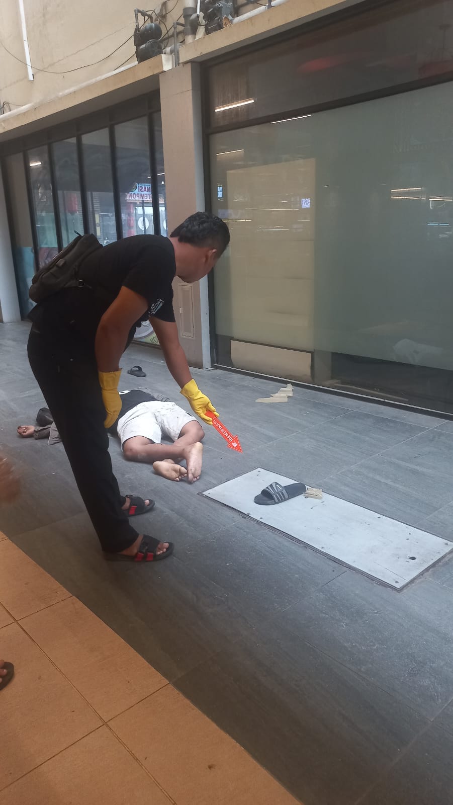 Saat diperiksa, korban diketahui sudah tidak merespons. Sekuriti mencoba mengecek pernapasan korban dengan menempelkan jari di dekat hidungnya, namun tidak merasakan adanya hembusan napas.