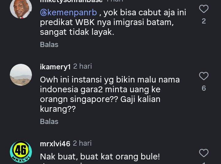 ”Yok bisa cabut aja ini predikat WBK-nya Imigrasi Batam, sangat tidak layak,” tulis @miketysonfanbase di kolom komentar.