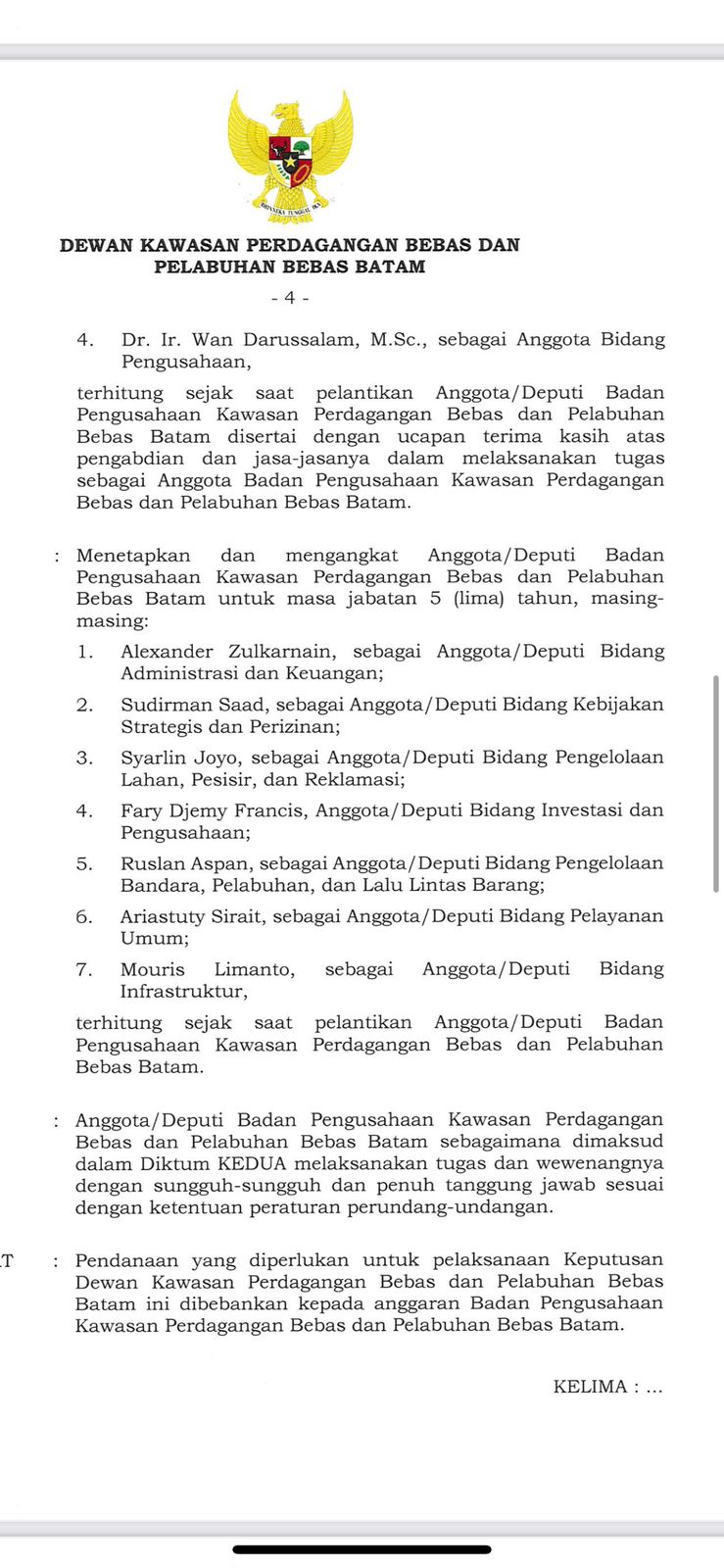 menetapkan dan mengangkat Anggota Deputi Badan Pengusahaan Kawasan Perdagangan Bebas dan Pelabuhan Bebas Batam untuk masa jabatan 5 (lima) tahun, masing-masing: