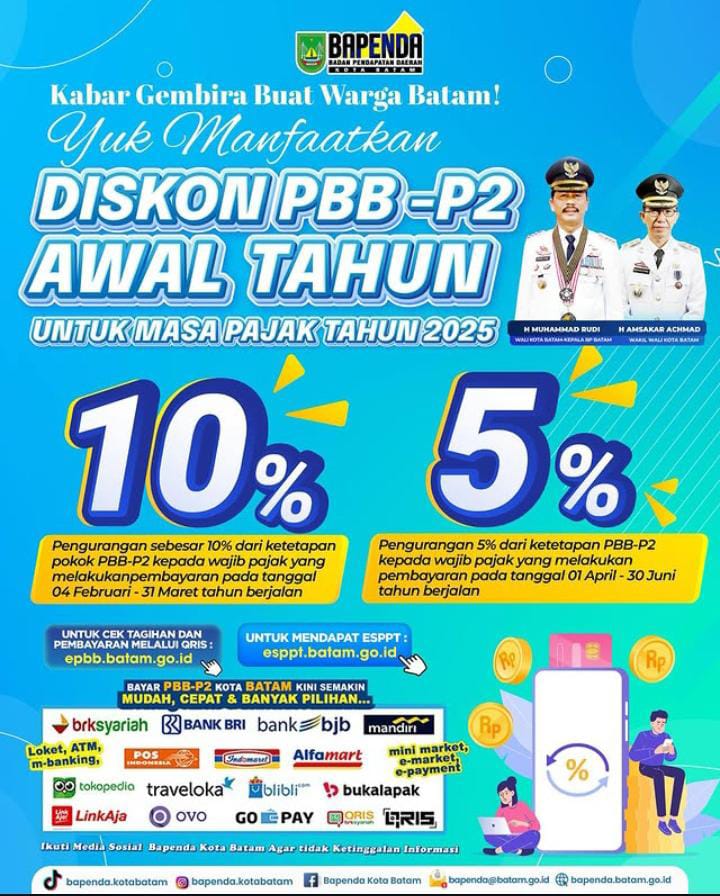 Bataminfo.co.id, Batam – Kabar gembira bagi warga Batam! Badan Pendapatan Daerah (Bapenda) Kota Batam kembali memberikan diskon Pajak Bumi dan Bangunan Perdesaan dan Perkotaan