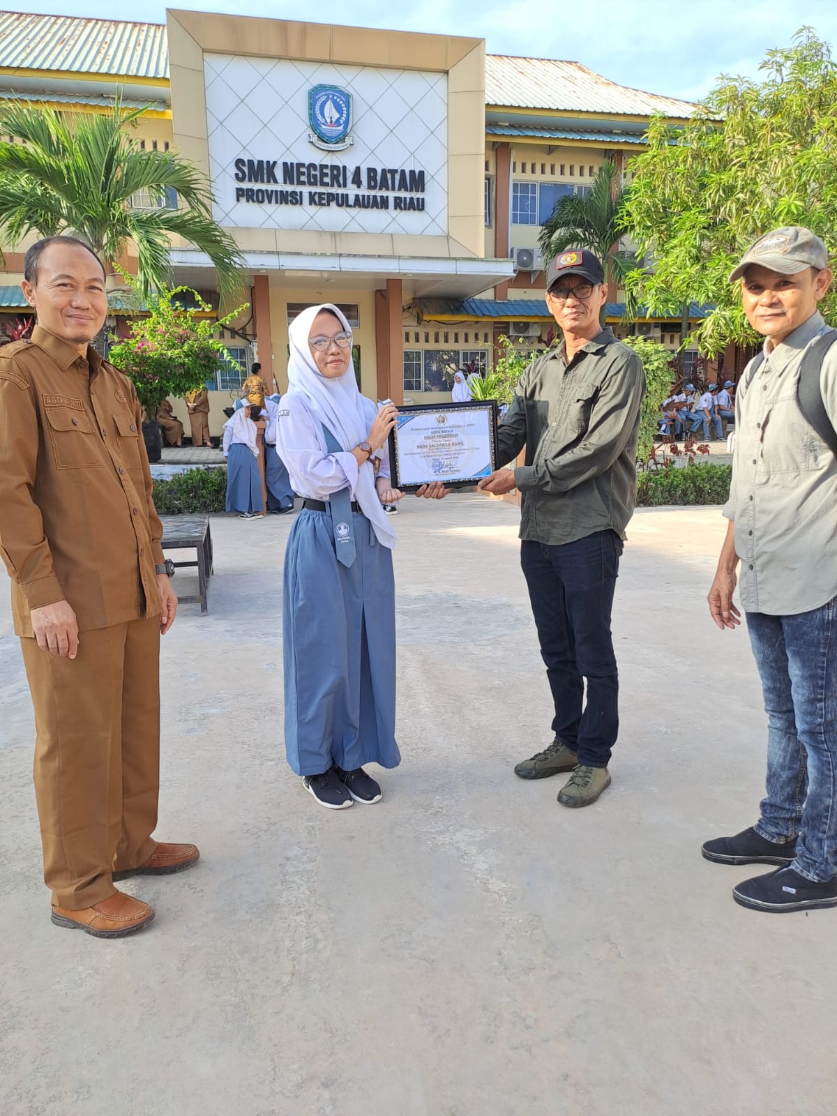 Ketua PWI Batam, M.A. Khafi Ansari, melangkah ke depan bersama tim pendidikan PWI Batam—Dedi Sulaiman, Arment Aditya, dan Muhammad Kamil—didampingi Kepala SMKN 4 Batam, Abdul Mukti. Piagam itu bukan sekadar selembar kertas berbingkai. Ia adalah pengakuan bahwa imajinasi seorang pelajar memiliki tempat terhormat di tengah masyarakat.