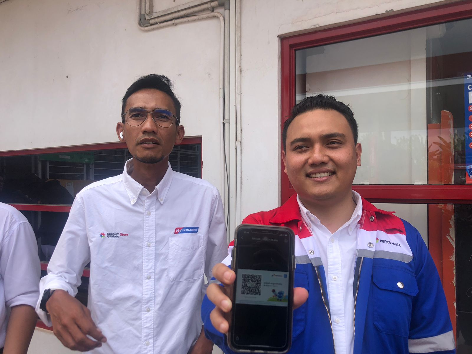 Agung menunjukkan cara kerja penggunaan QR Code, dengan membuka aplikasi My Pertamina, melakukan scan barcode, dan proses selesai.