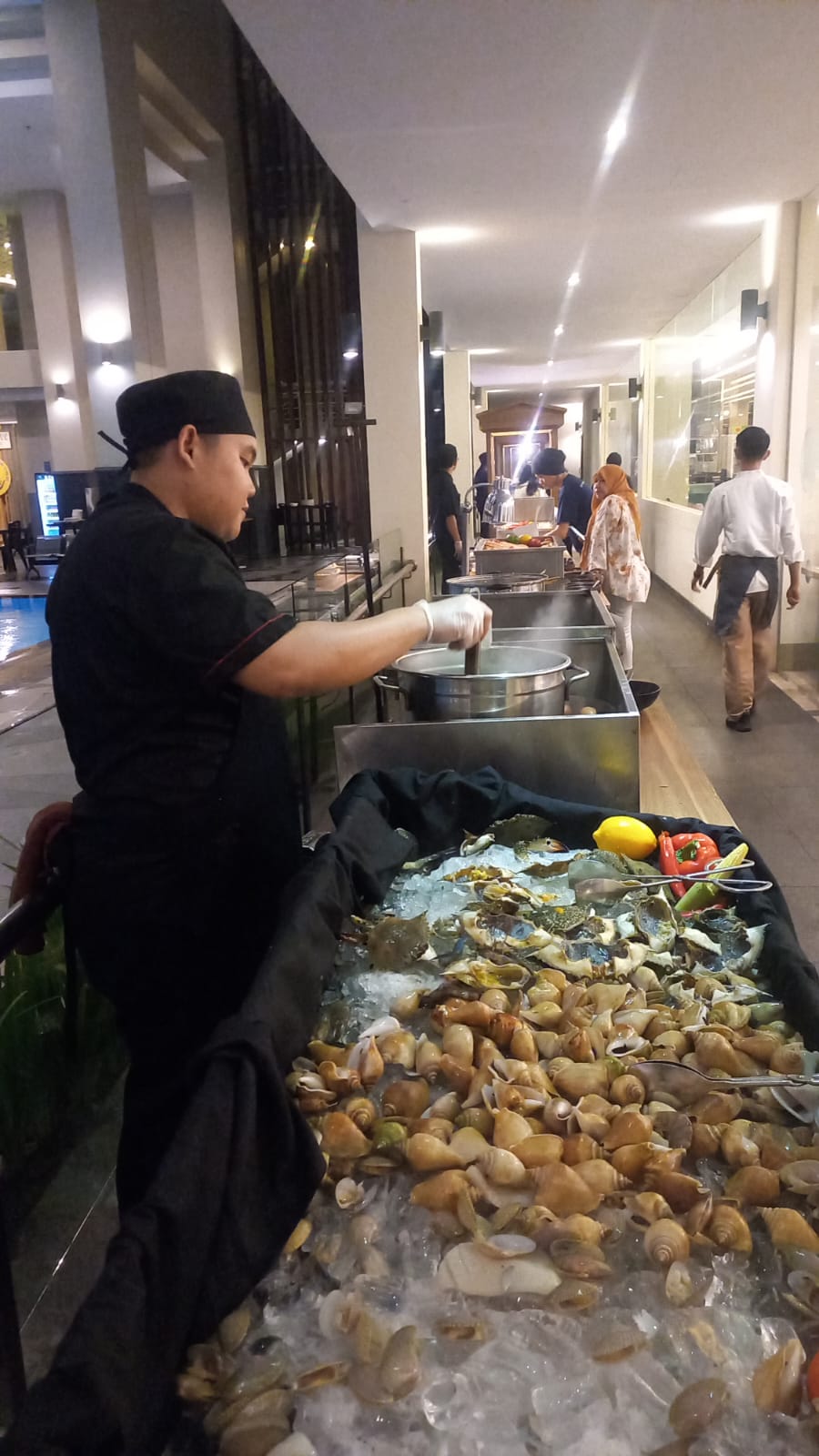 “Untuk menunya kita ada fresh seafood, live station, semuanya live cooking. Kalau enggak bisa makan seafood, kita juga ada chicken skewers, ada ayam, ada nasi, ada mie dan juga ada good vegetable station. Selain itu, kita juga ada fresh treats,” ucapnya.