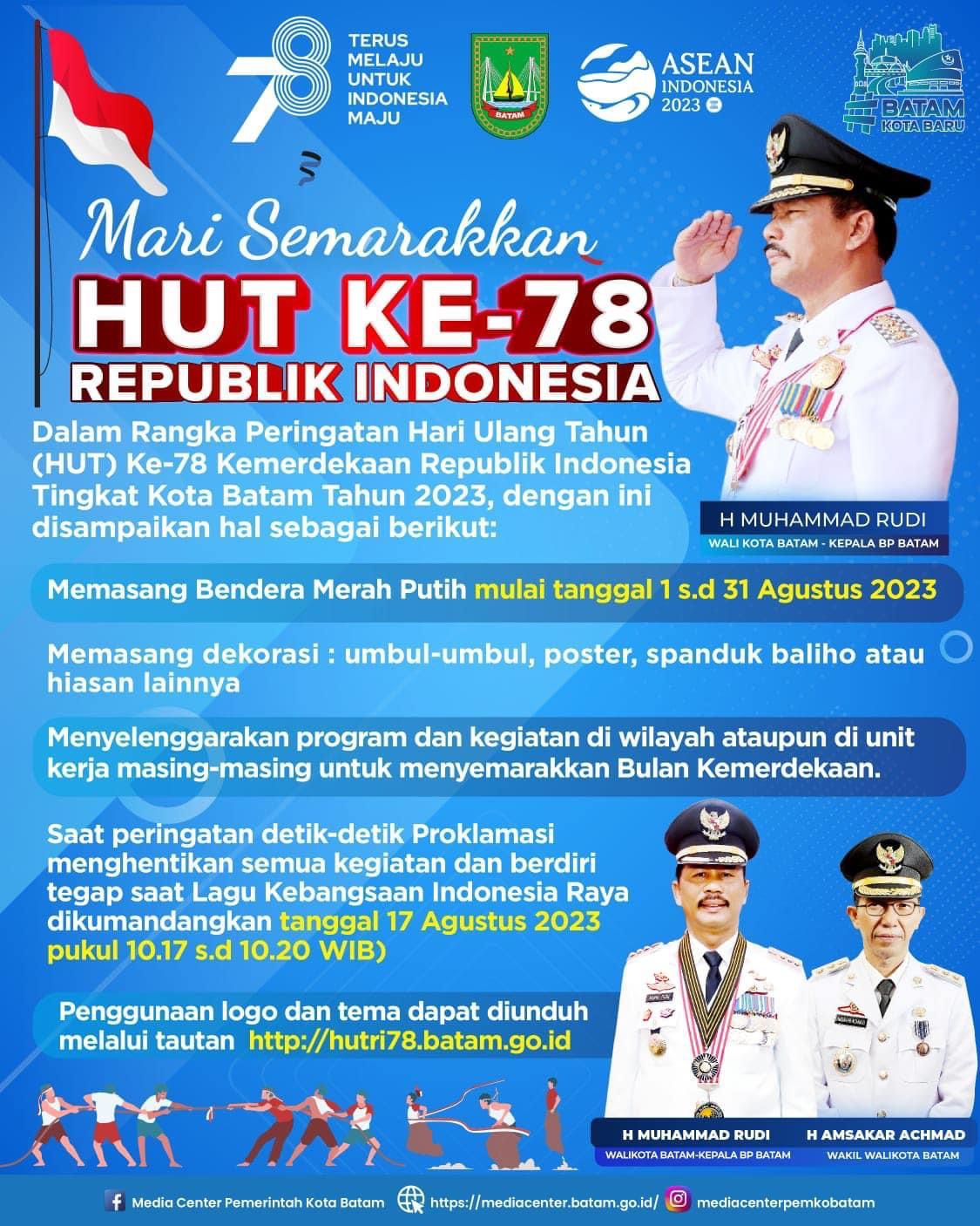 Bataminfo.co.id, Batam – Dalam rangka menyemarakkan Peringatan Hari Ulang Tahun (HUT) ke-78 Kemerdekaan Republik Indonesia (RI) tingkat Kota Batam tahun 2023, Pemerintah Kota Batam mengajak seluruh lapisan masyarakat untuk turut berpartisipasi memeriahkan perayaan tahun ini.