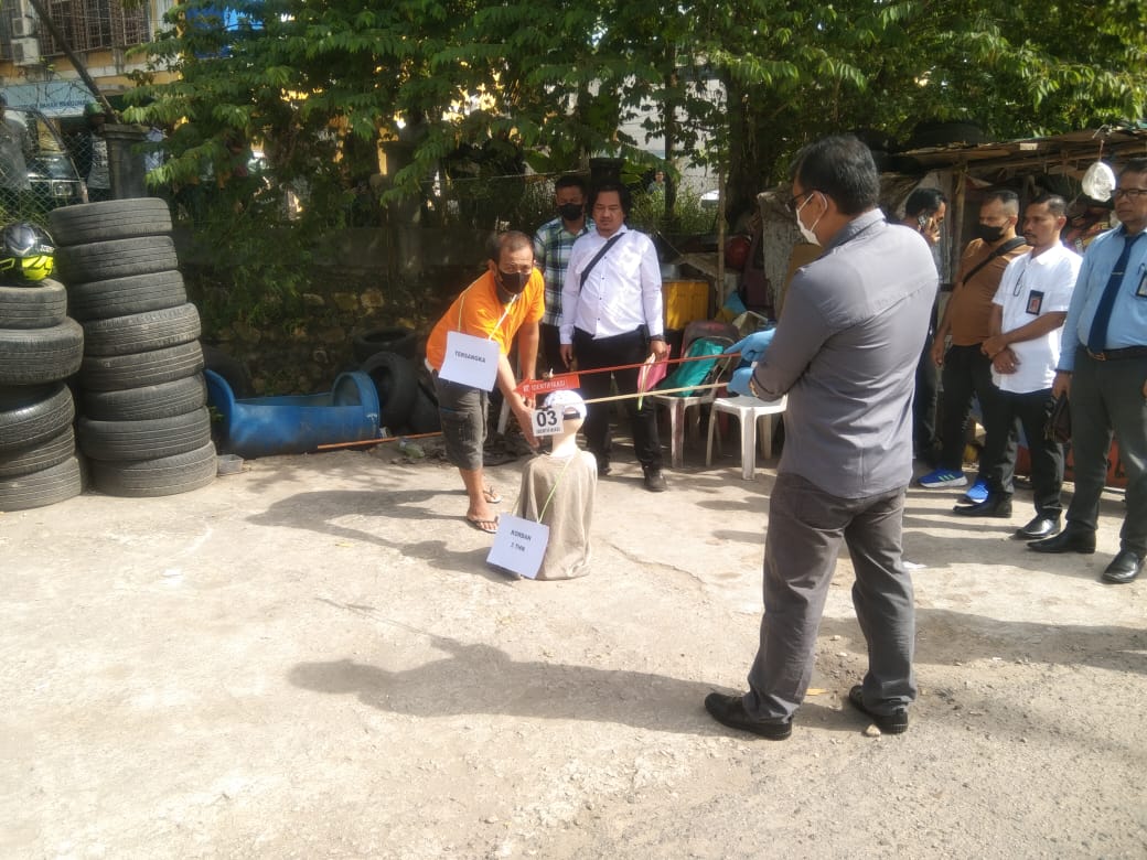 Reka ulang adegan pembunuhan itu dimulai dari korban yang berinisial NBS (3 tahun) dititipkan oleh orang tuanya kepada pelaku Bakti Parlindungan (42 tahun) di dekat Warung tambal ban karena orang tua korban sibuk bekerja.