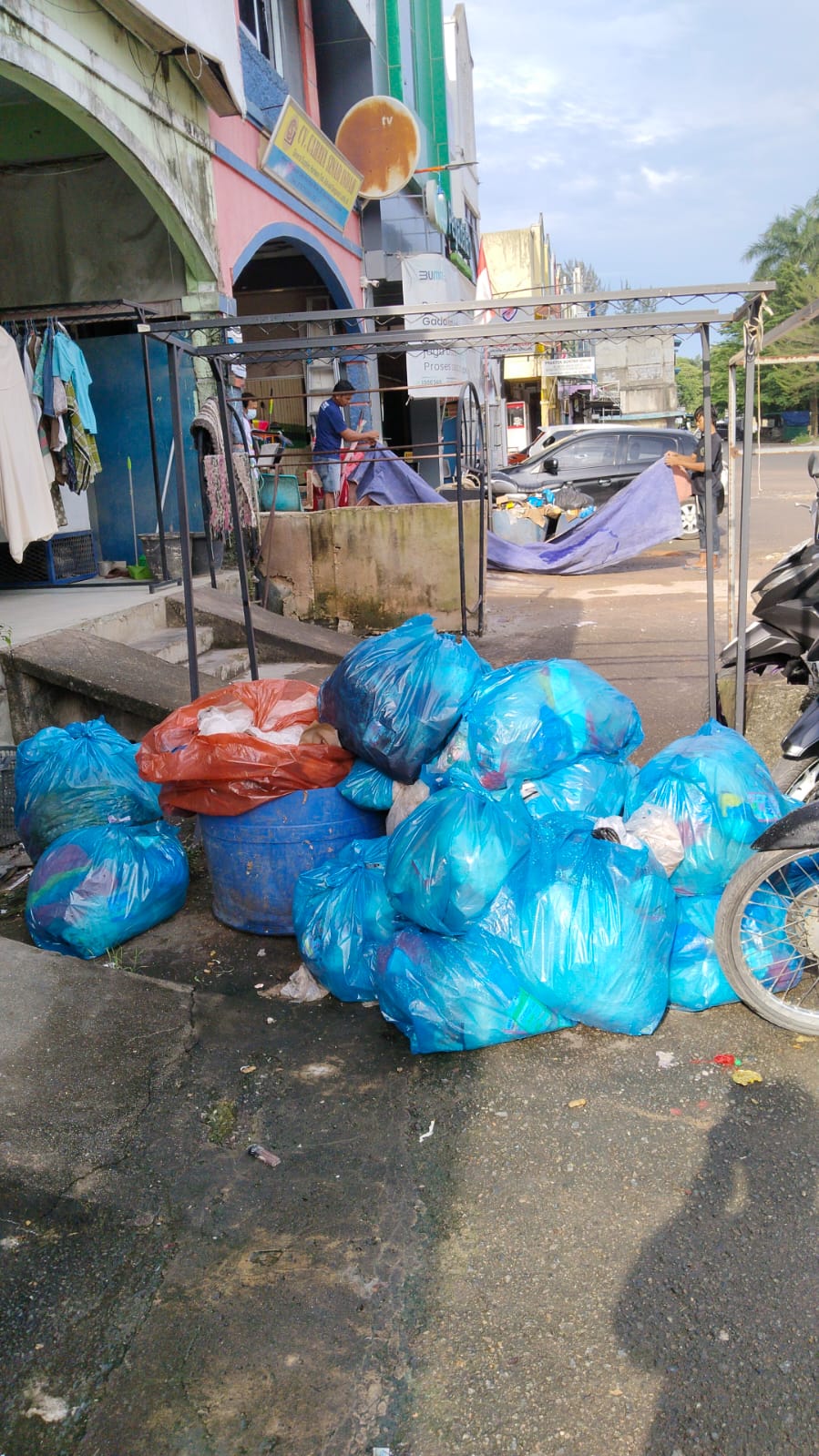 Dari pantauan di lapangan , kantong kantong sampah menumpuk di depan ruko saking banyak nya hingga keluar dari tong sampah ,hingga bau tidak sedap pun tercium saat orang lewat .