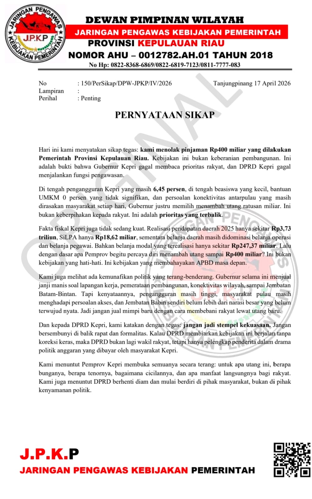 Bataminfo.co.id, Tanjungpinang – Kebijakan pinjaman daerah senilai Rp400 miliar oleh Pemerintah Provinsi Kepulauan Riau menuai kritik tajam. Ketua Harian Jaringan Pengawas Kebijakan Pemerintah (JPKP) Provinsi Kepri, Fachrizan, S.Sos, menyatakan sikap tegas menolak kebijakan tersebut dan menilai langkah itu sebagai bentuk kegagalan pemerintah membaca kebutuhan riil masyarakat.