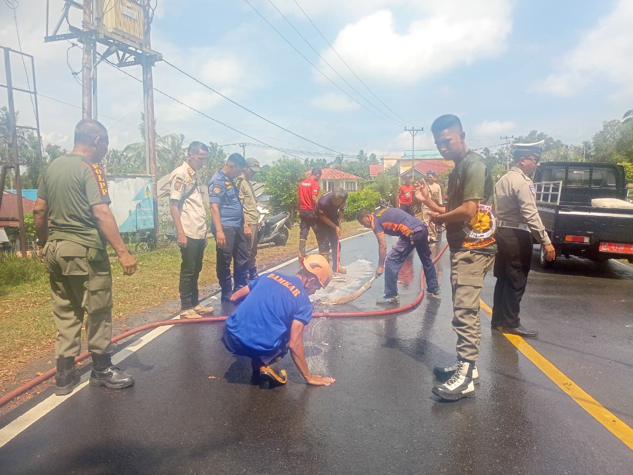 Menindaklanjuti laporan itu, petugas Damkar langsung menuju lokasi untuk melakukan pembersihan jalan, karena tumpahan minyak tersebut berpotensi mencelakakan pengendara.